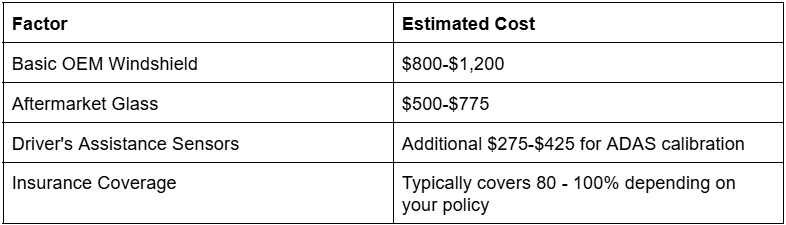 For most Ford Bronco models, windshield replacement typically costs between $500 and $1,200, depending on the specific model. If your Bronco is equipped with ADAS (Advanced Driver Assistance Systems), an ADAS recalibration will also be required, which generally adds another $250 to $400, depending on the features installed. Here’s a quick breakdown: